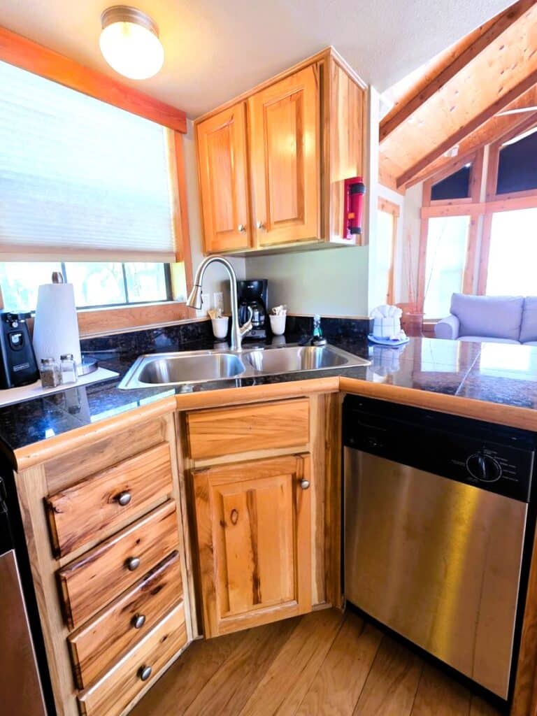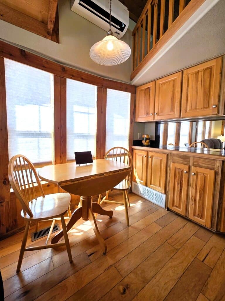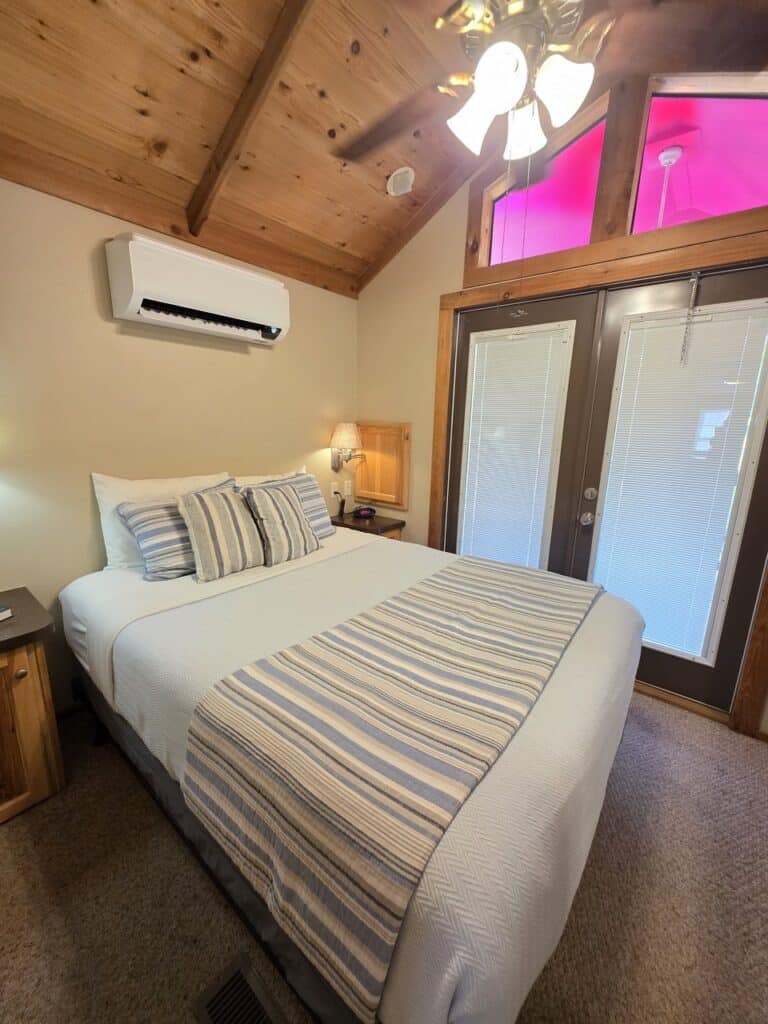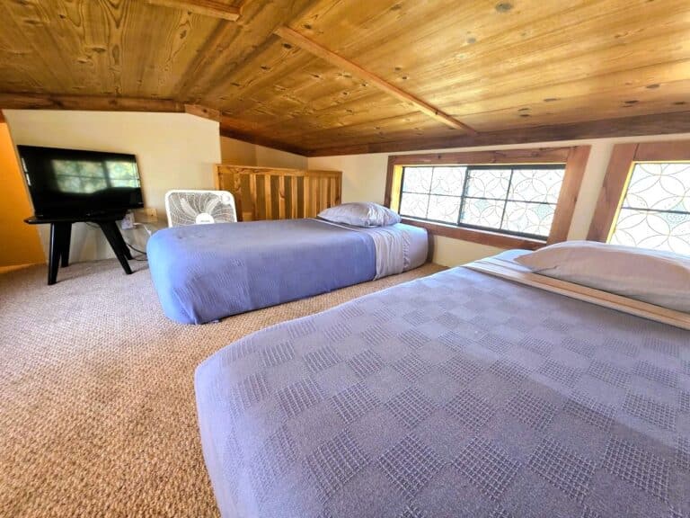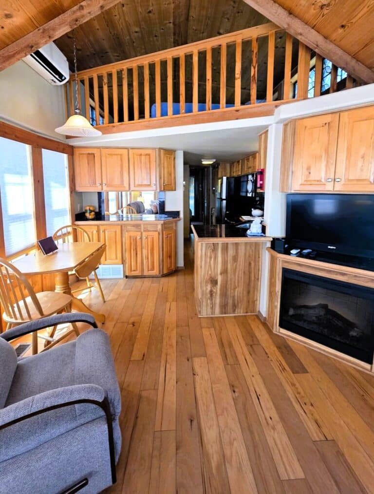 Cottage 57 offers a private bedroom with a queen-size bed and television, and a loft with two twin-size mattresses and television. The living room has a queen-size sleeper sofa and electric fireplace. This cottage has a washer and dryer, full kitchen with a coffee pot, microwave, refrigerator, dish washer, stove, and a variety of dishes for personal use.