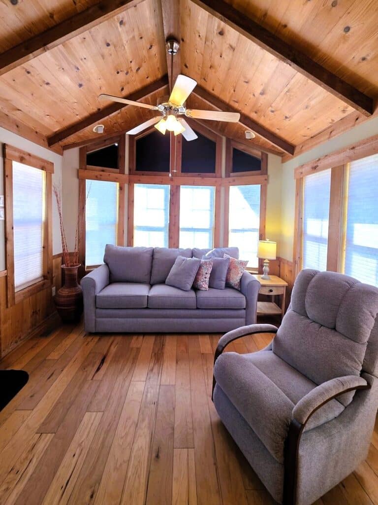 Executive cottage with a red metal roof and a modern, rustic interior.