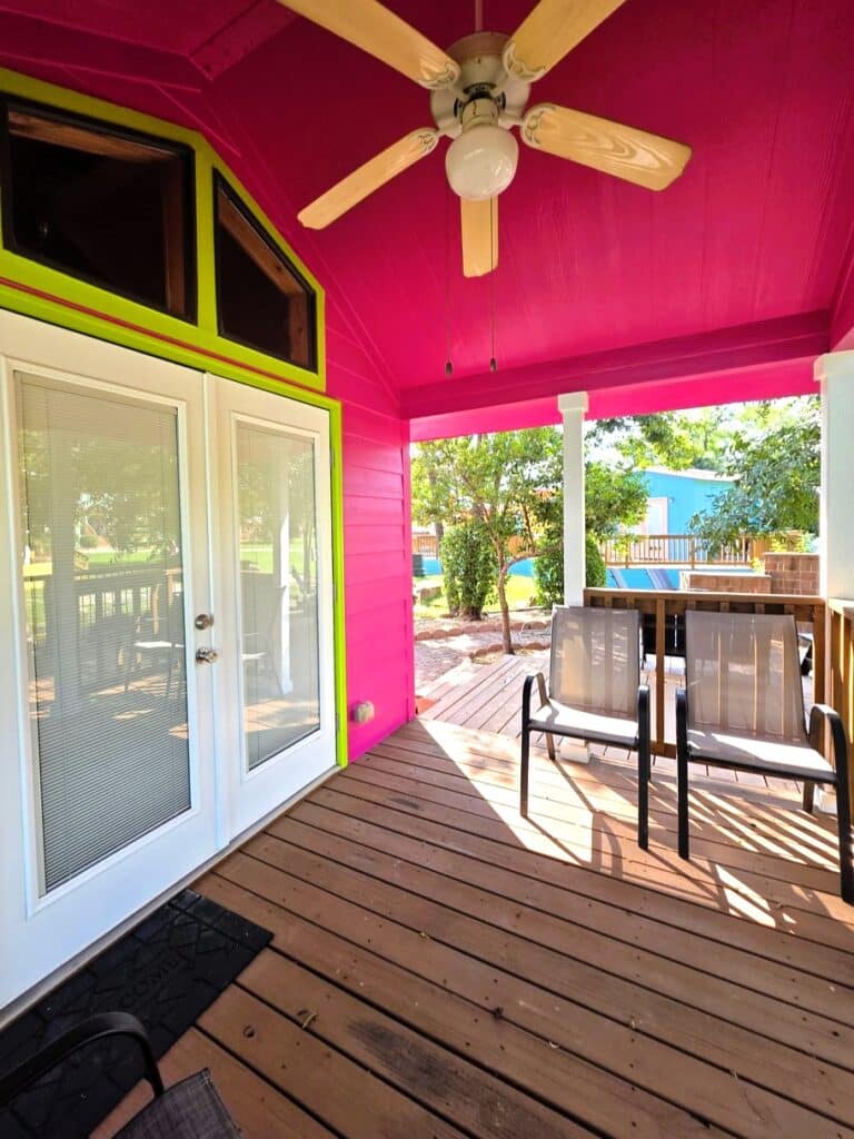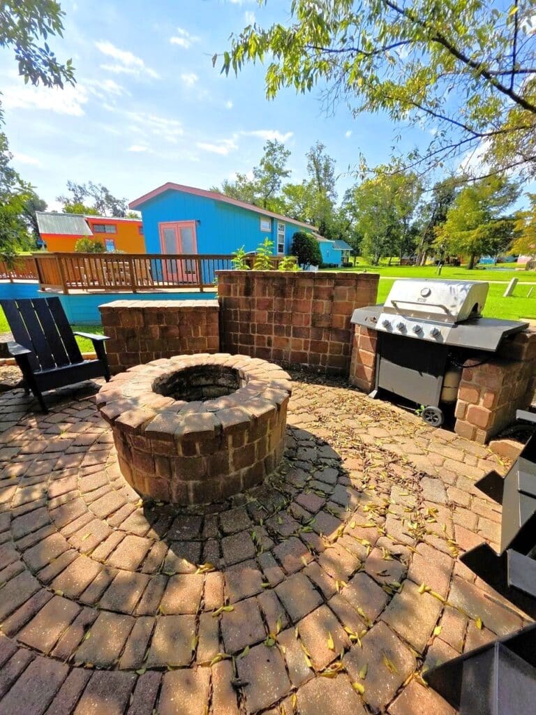 The outside area has an extended front and back deck with patio furniture, rocking chairs, gas grill, and stone fire pit.