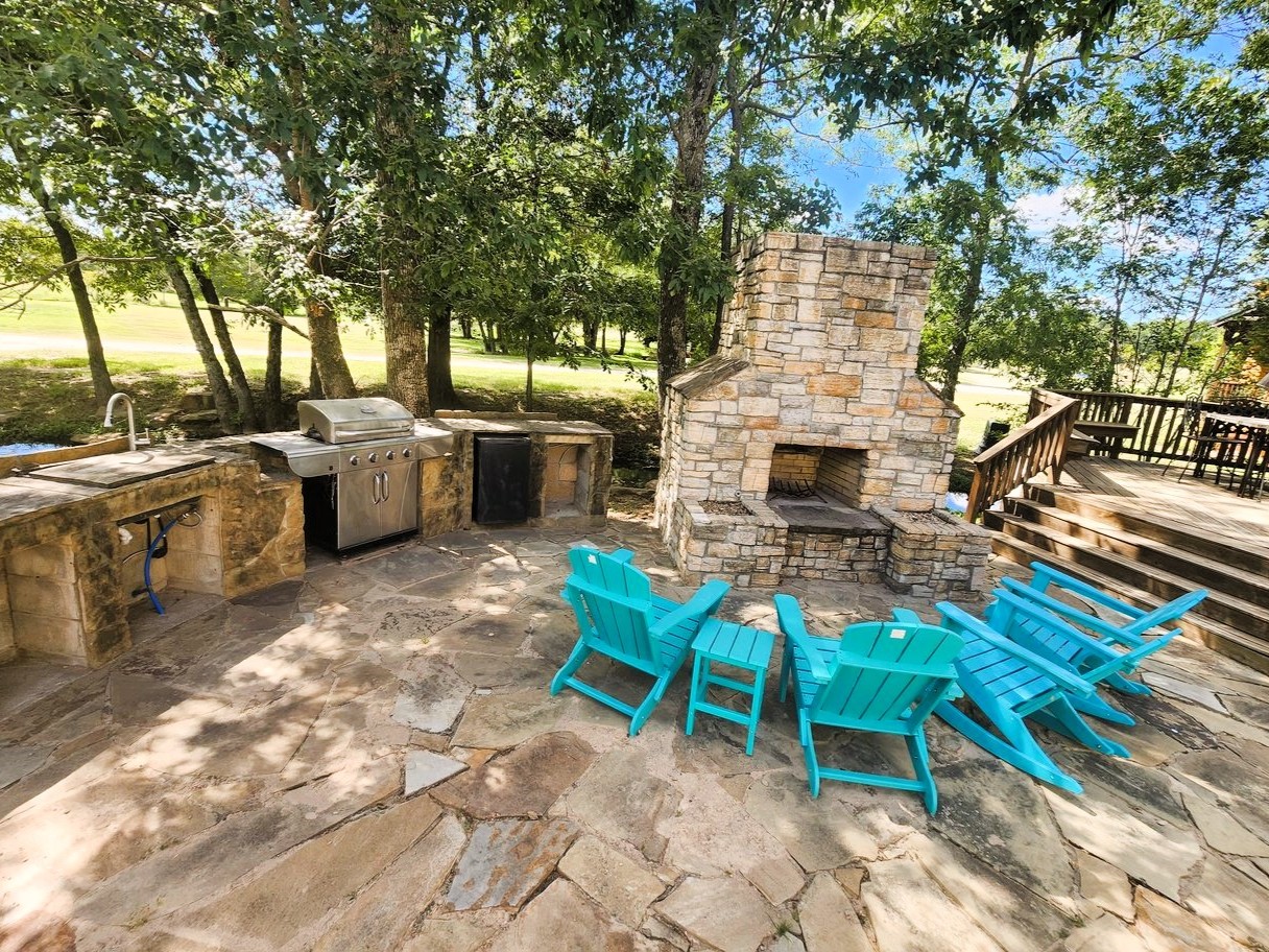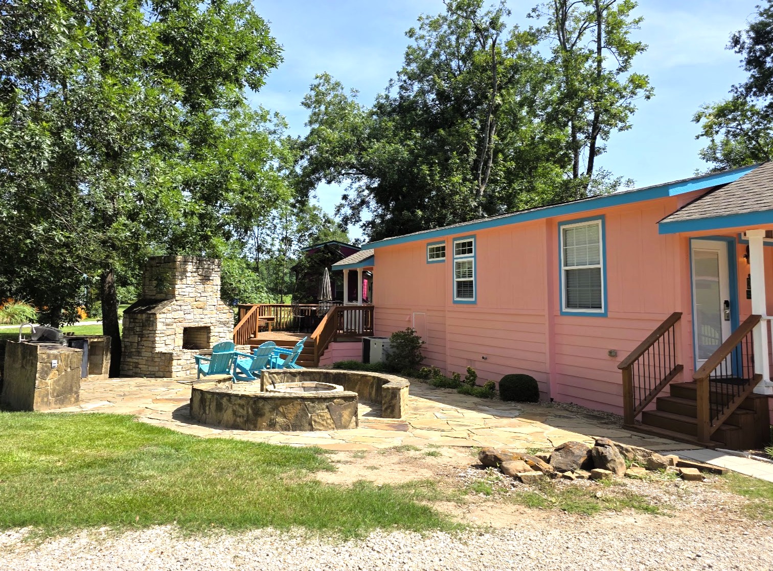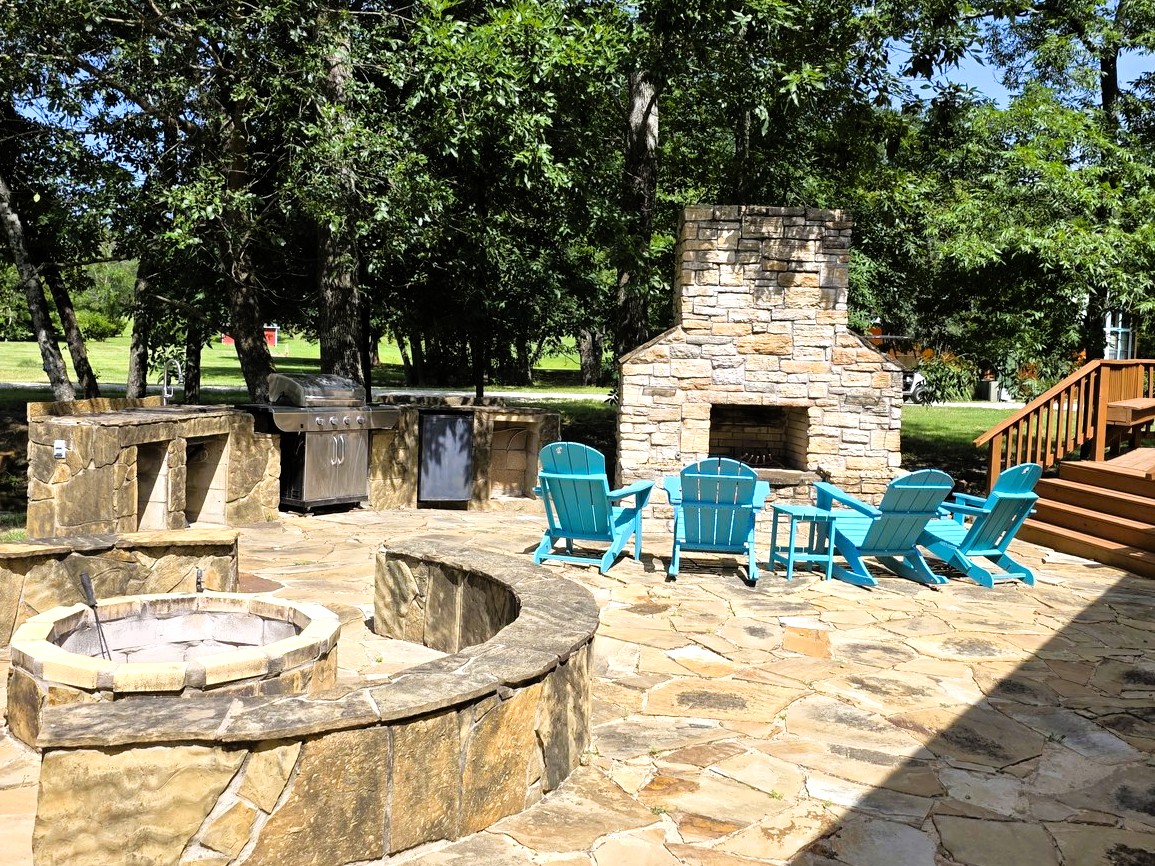 The exterior features a large fireplace, outdoor kitchen, patio furniture, stone fire pit, porch swing, and a deck that joins up with cottage 25.