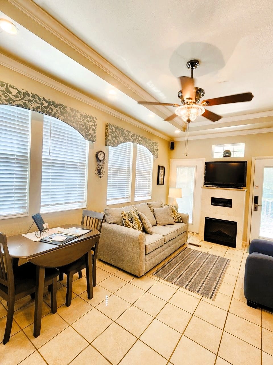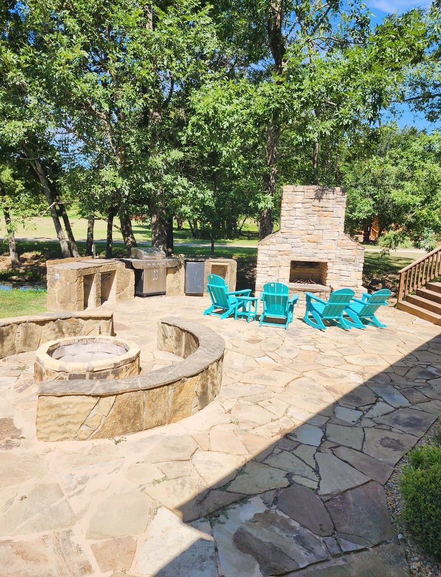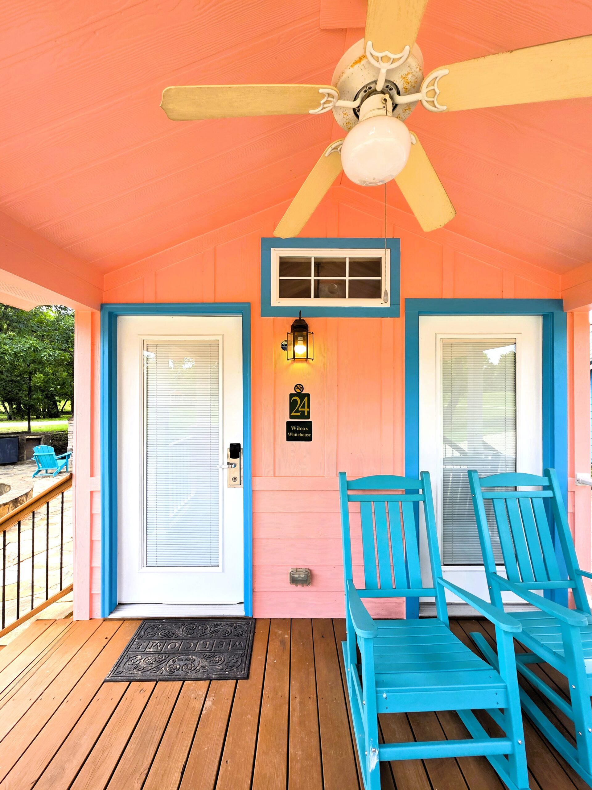 The exterior features a large fireplace, outdoor kitchen, patio furniture, stone fire pit, porch swing, and a deck that joins up with cottage 25.