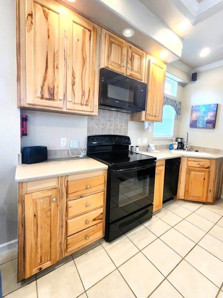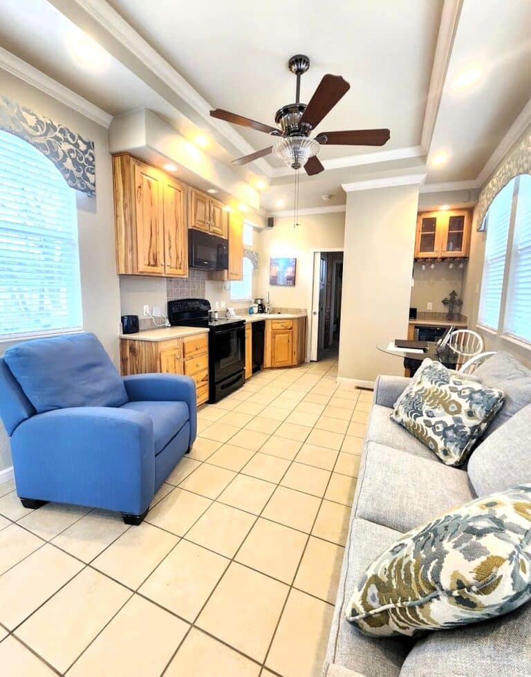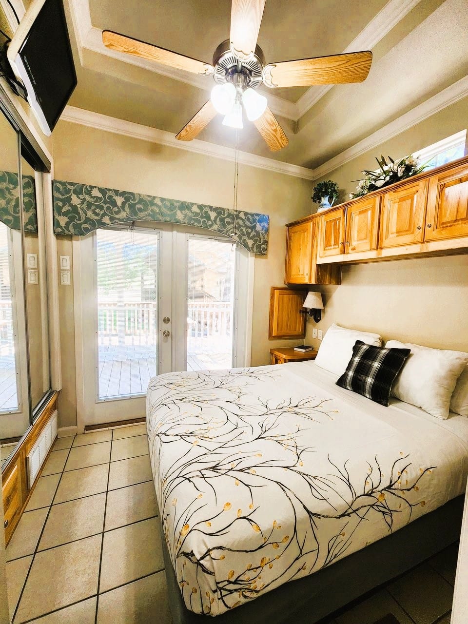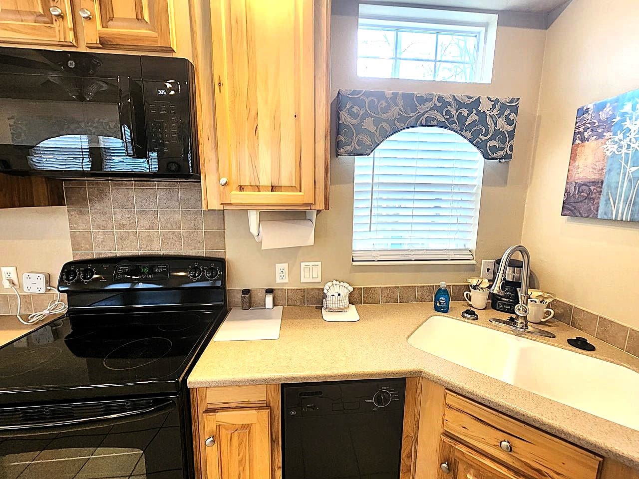 Cottage 24 has a private bedroom with a queen-size bed and television. The living room offers a queen-size sleeper sofa, flat screen TV, and an electric fireplace. The cottage also has a full kitchen that includes a coffee pot, toaster, microwave, refrigerator, electric stove, dishwasher and wine chiller.