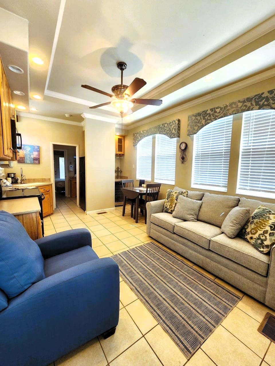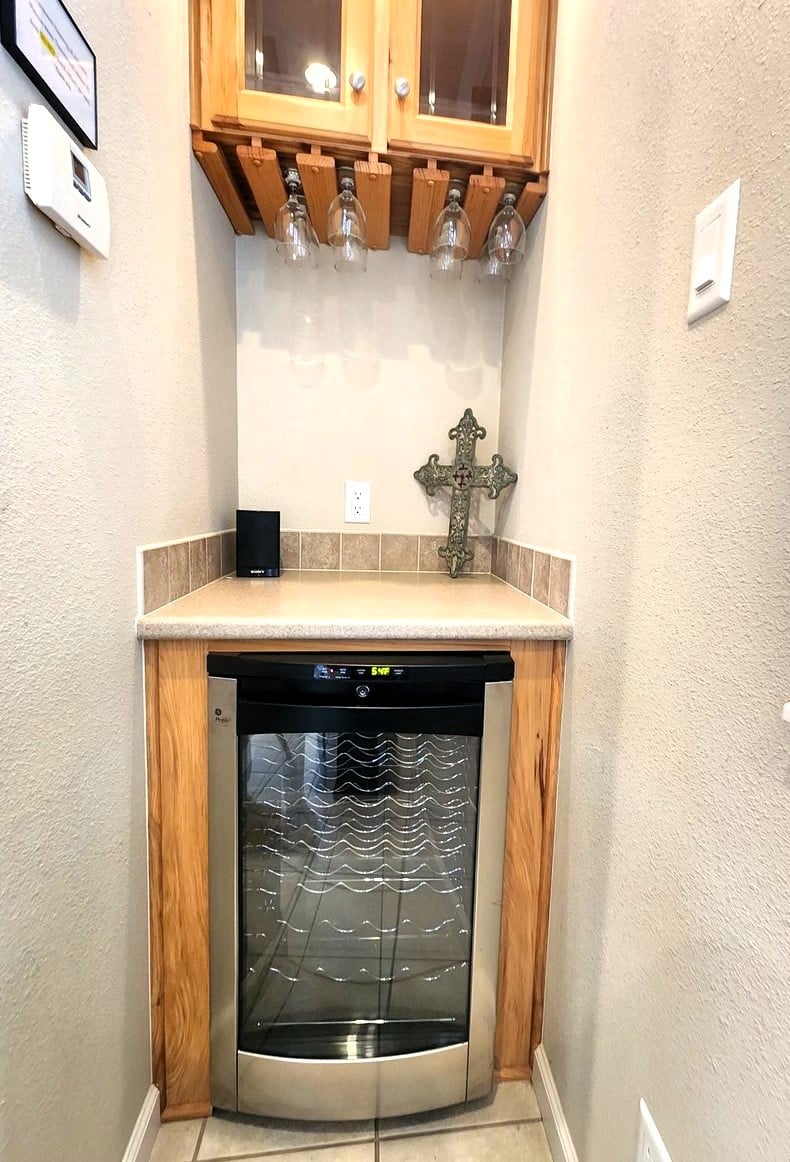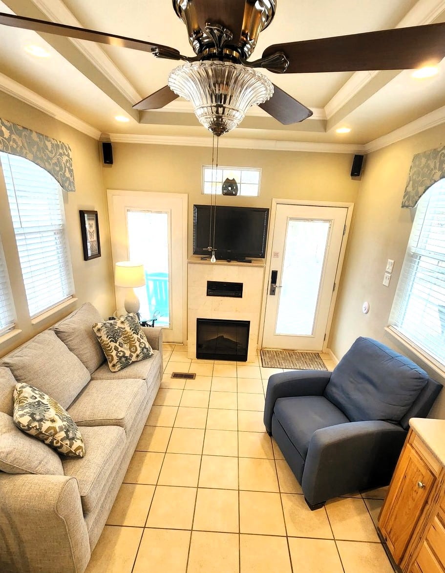 Cottage 24 has a private bedroom with a queen-size bed and television. The living room offers a queen-size sleeper sofa, flat screen TV, and an electric fireplace. The cottage also has a full kitchen that includes a coffee pot, toaster, microwave, refrigerator, electric stove, dishwasher and wine chiller.