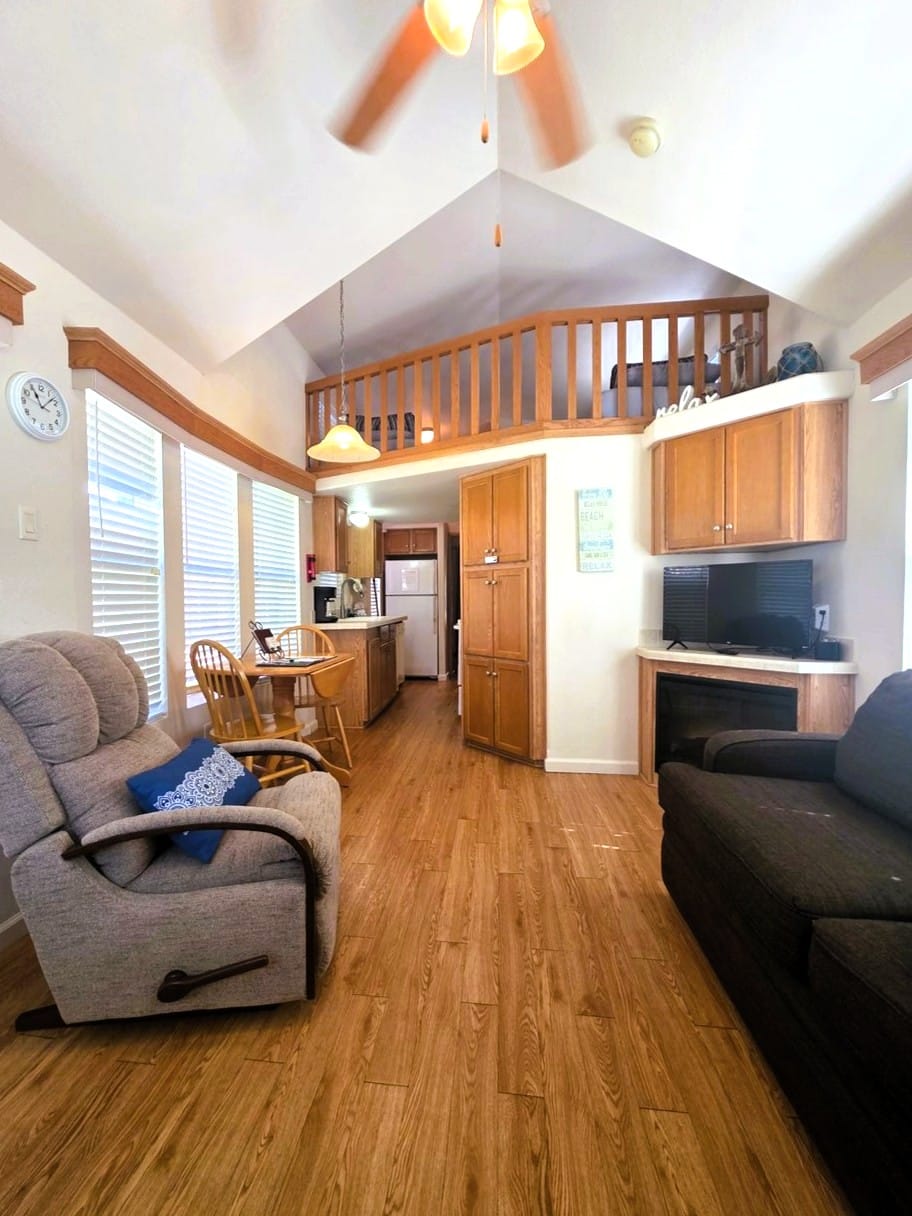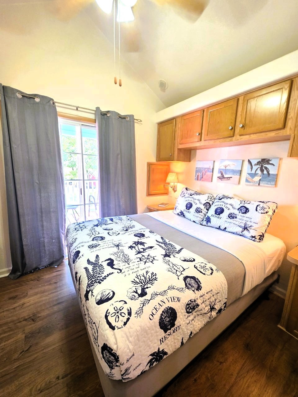 Cottage 84 will sleep up to six guests. There is one main bedroom with a queen-sized bed and television. The living room offers a full-sized sleeper sofa, television, and electric fire place. The loft area has two twin mattresses for an extra sleeping space. This cottage also includes a full kitchen, a washer and dryer set, and one bathroom.