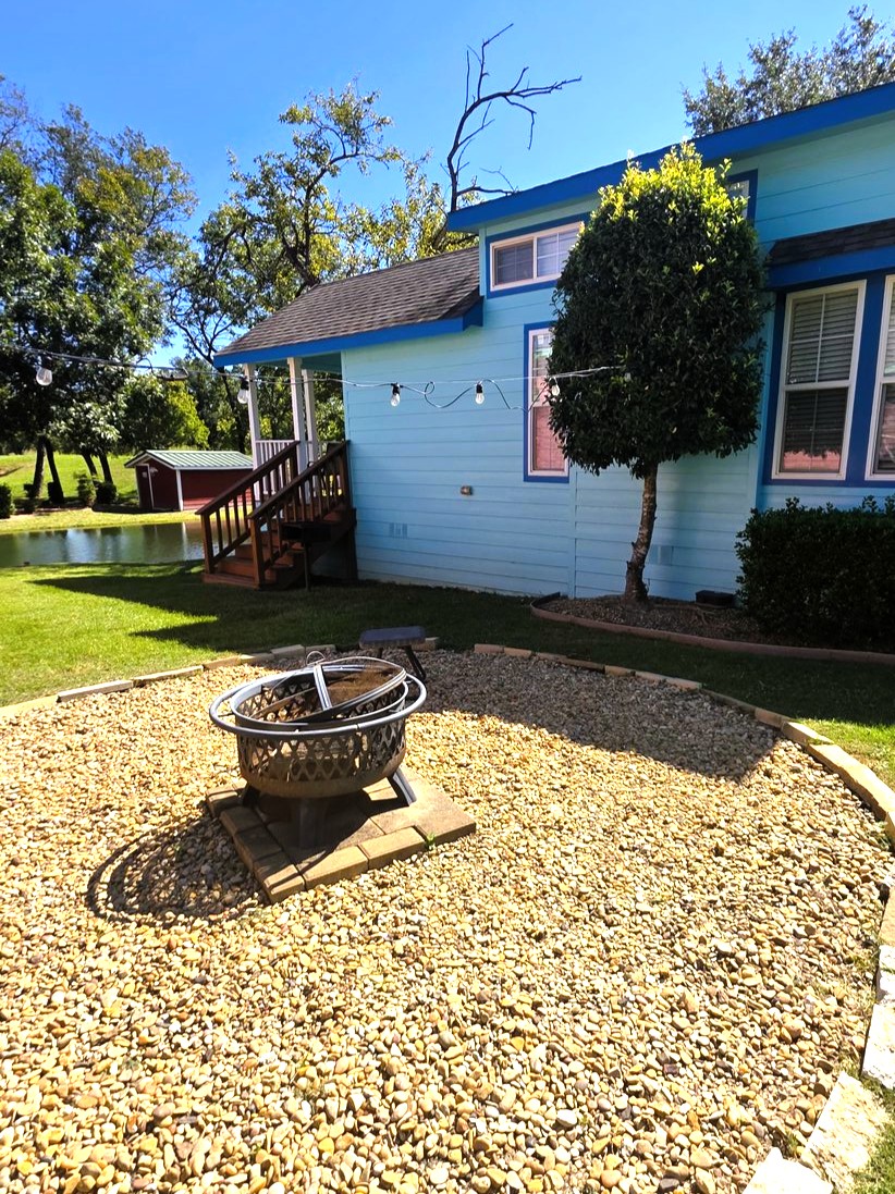 The outside area is nearby Angel Island, which has community fire pits and grills. There is a front and back porch with patio furniture, charcoal grill, and ring fire pit.