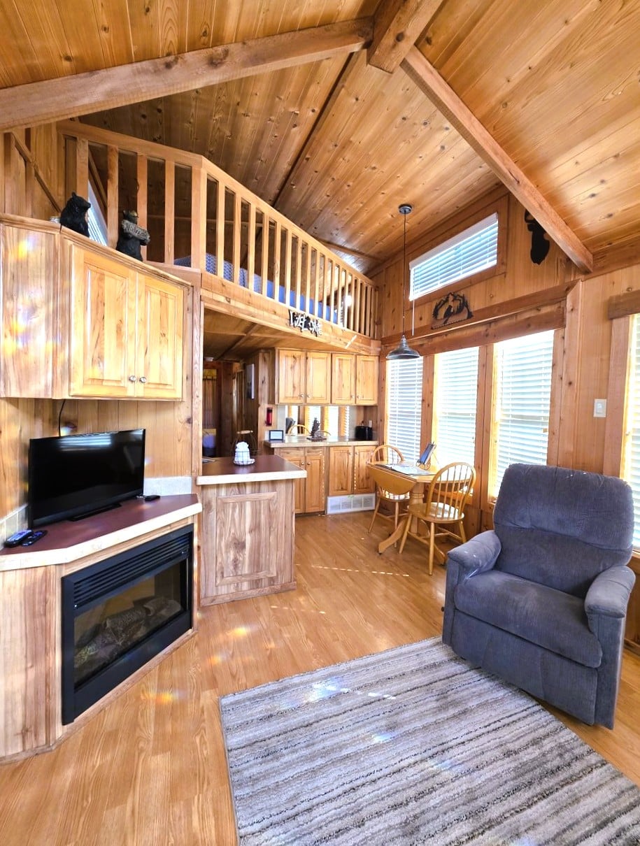 Cottage 88 sleeps up to six guests. There is one main bedroom with a queen-sized bed. The living room offers a full-sized sleeper sofa, television, and electric fire place. The loft area includes two twin mattresses. This cottage also has a bathroom, washer and dryer set, and a full kitchen.
