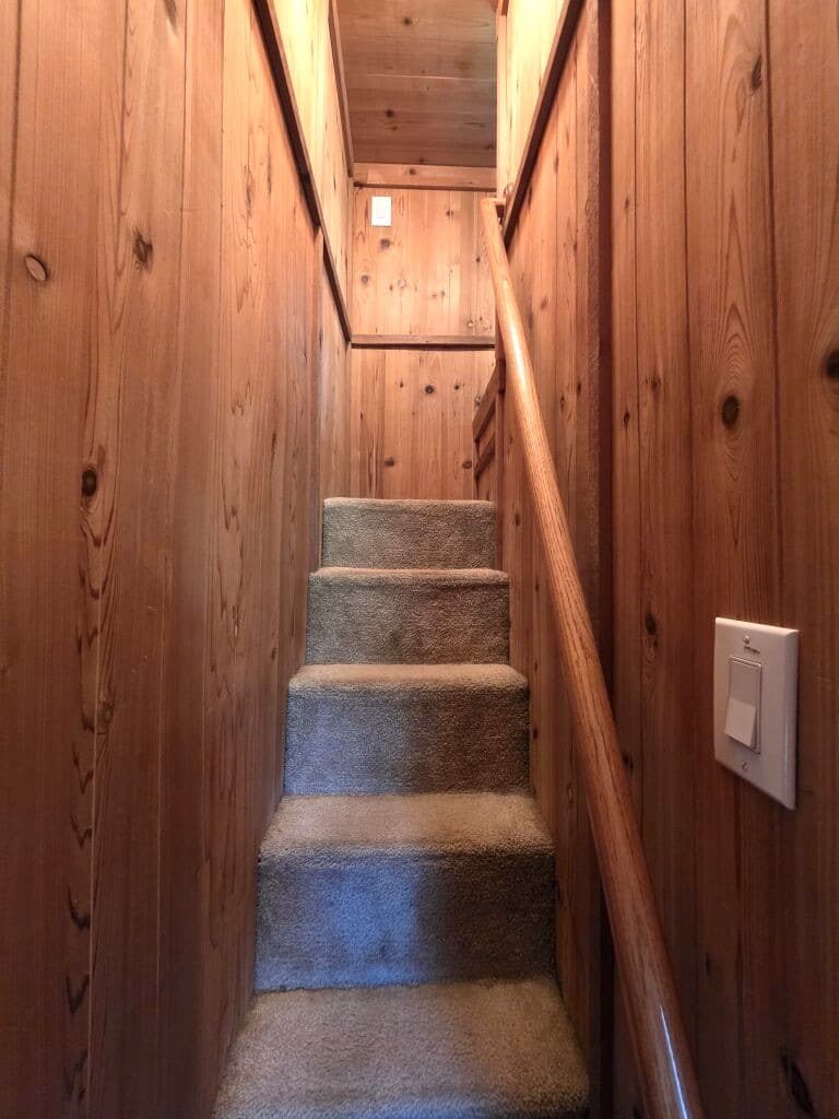 Lofted cottage with a rustic interior design.